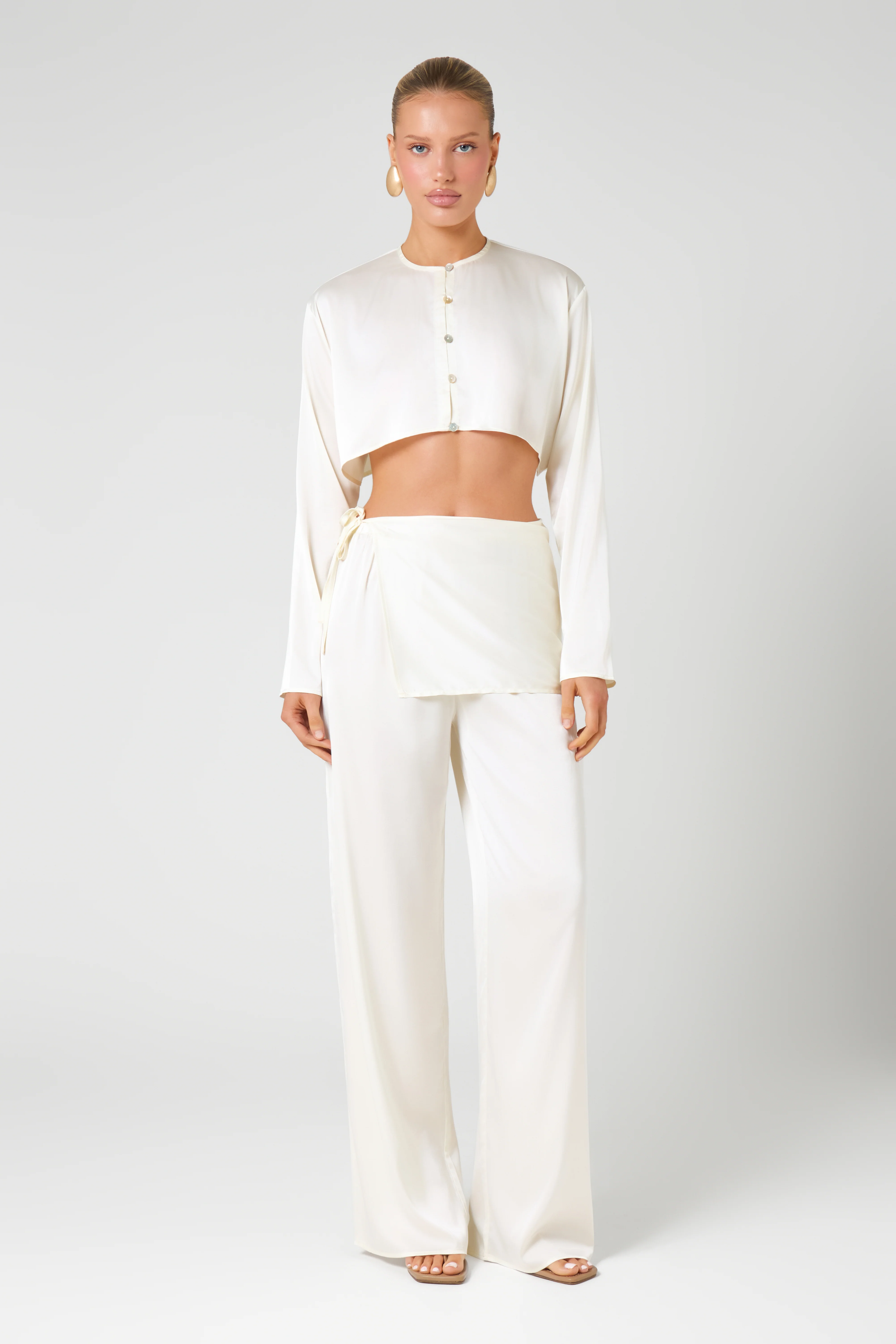 Cut from fluid satin, this bandana skirt is made to sit over the co-ord, adding depth and contrast through its asymmetric wrap silhouette. The soft drape and adjustable tie detail create a refined, effortless finish. Minimal in form, transformative in effect.