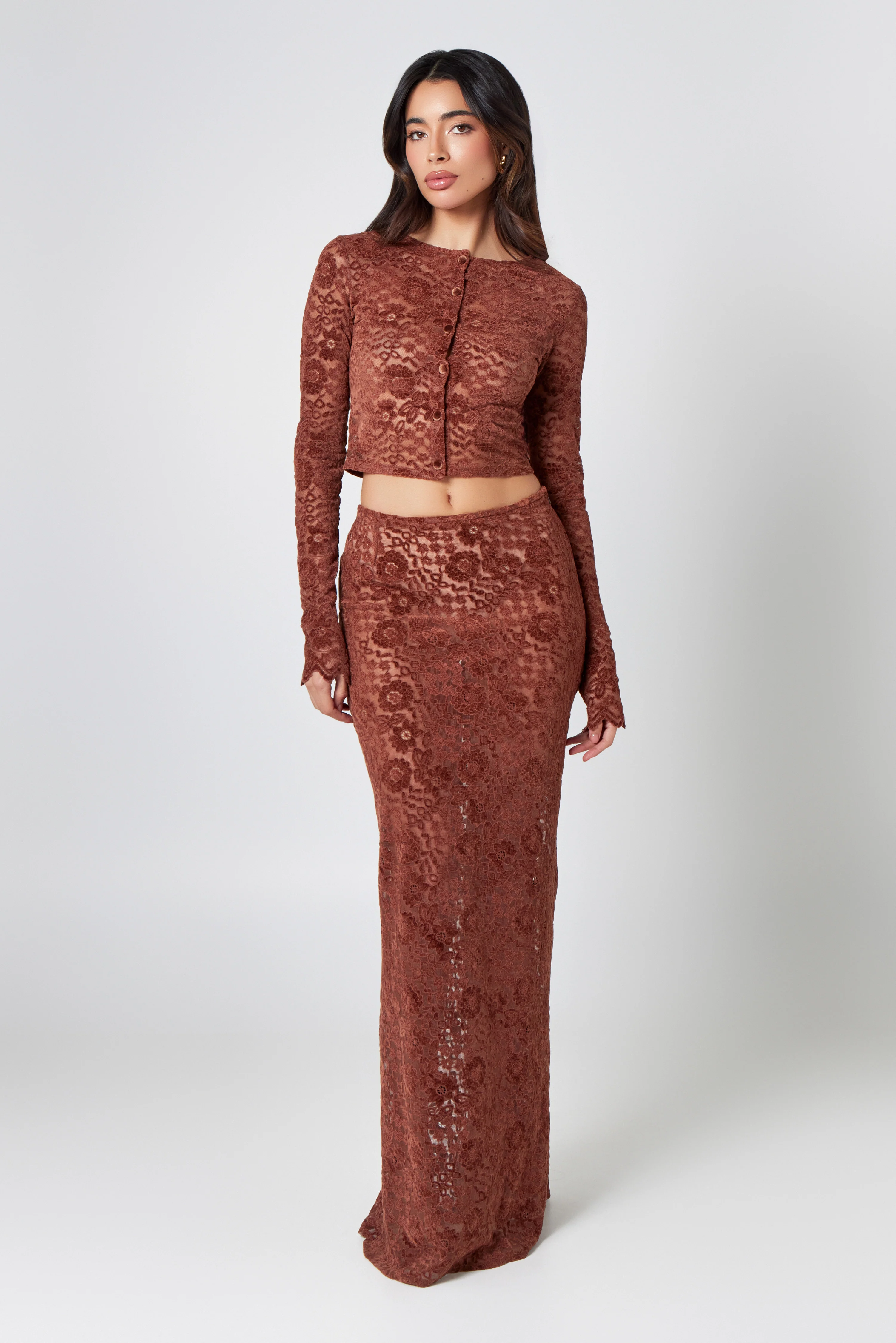 The latest version of our sell out Co Ord is Cut in a romantic silhouette, sitting mid waist with a side zip closer and crafted in a luxurious toffee velvet lace with a Co ordinating button top.